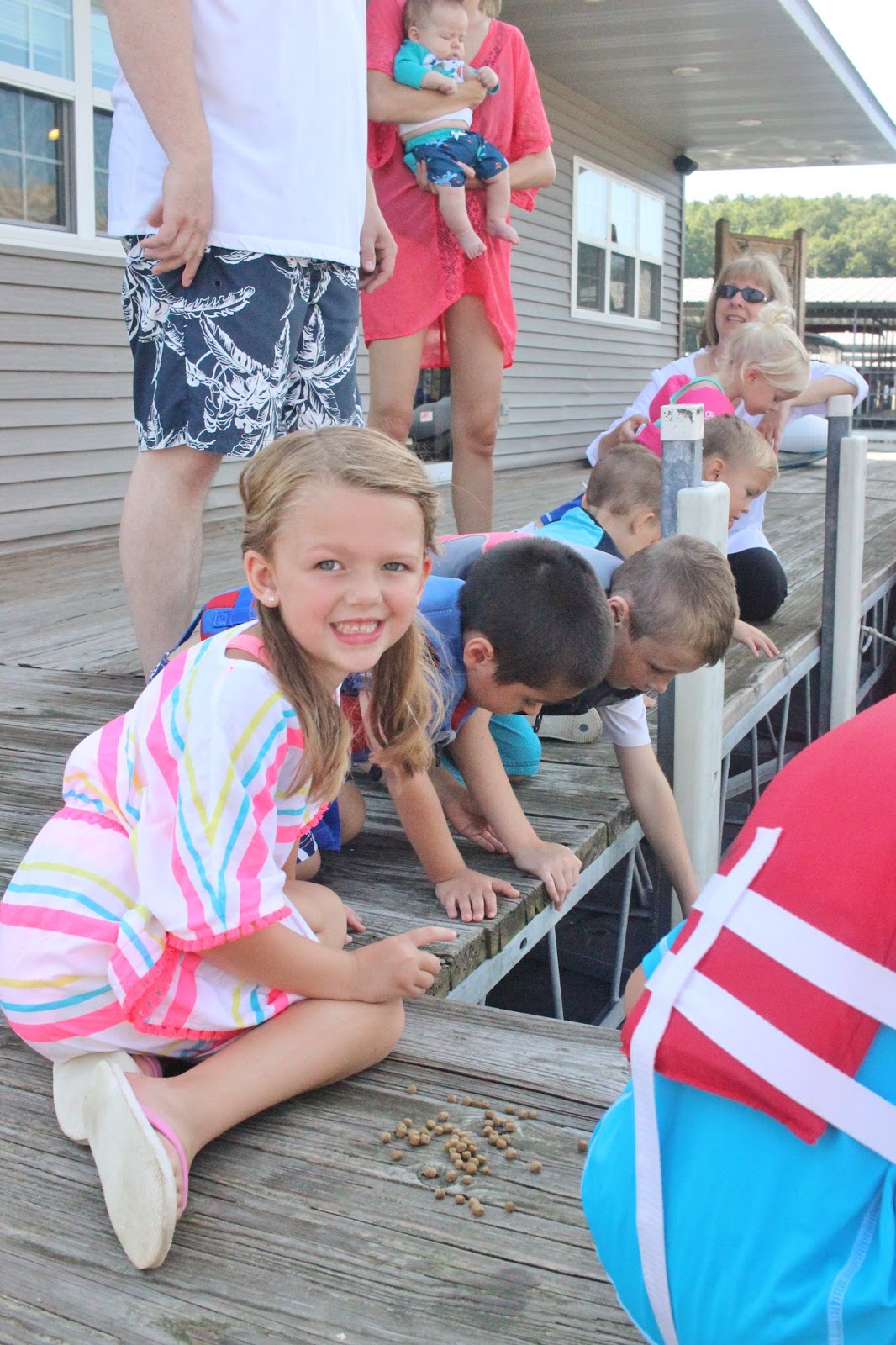 I had to get a picture of everyone feeding the carp fish before we loaded onto the boat. I remember feeding fish from this dock as a kid. It's so funny to watch my kids do the same.