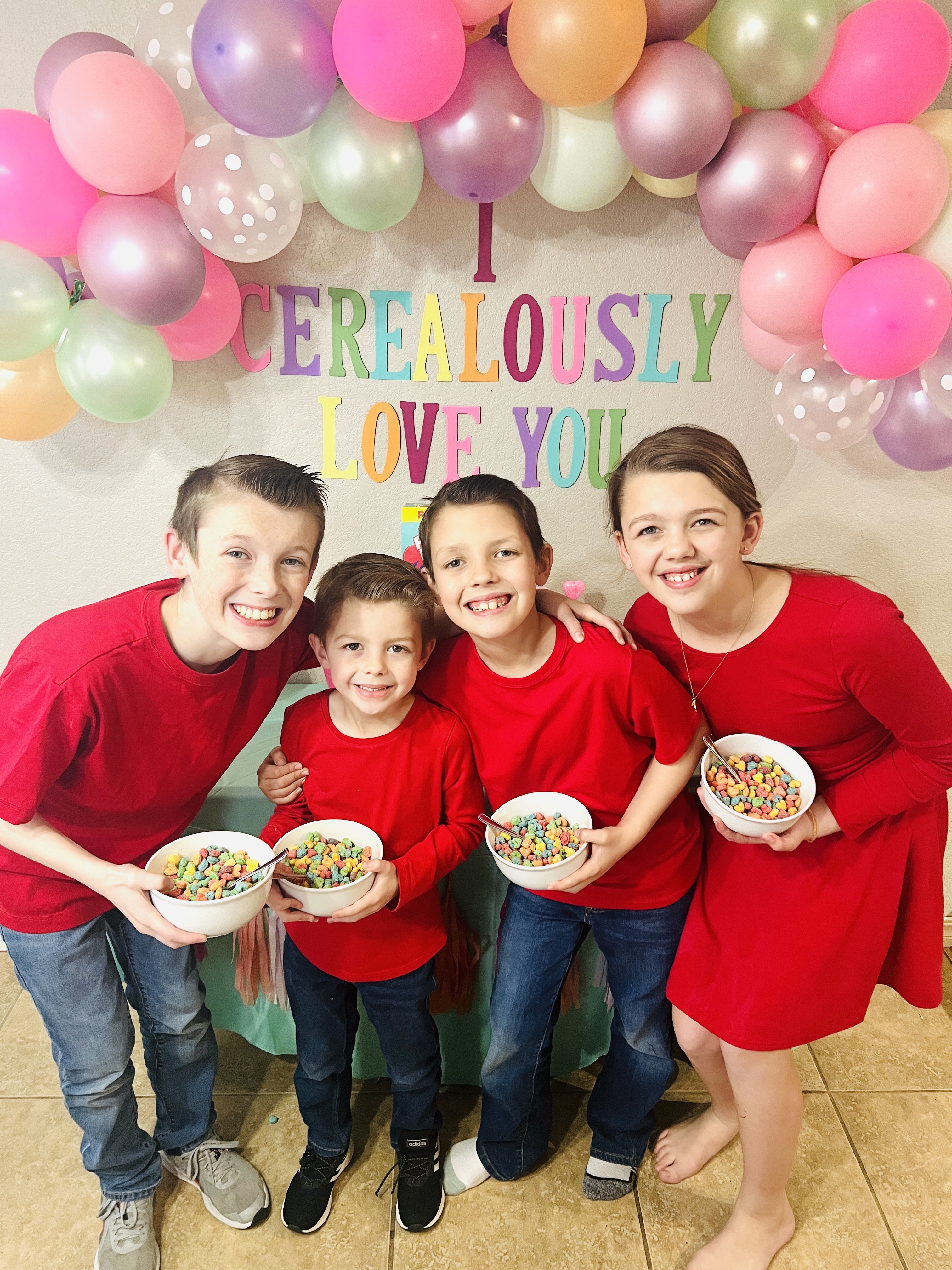 I kind of love this theme. "I Cereal-ously Love you" and I served these cute heart-shaped fruit loops and cute cereal bowl shaped pancakes.